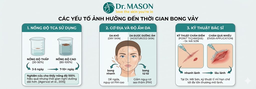 Lưu ý từ chuyên gia: Theo Hiệp hội Phẫu thuật Da liễu Hoa Kỳ (ASDS), thời gian bong vảy có thể kéo dài hơn (lên đến 14 ngày) đối với những người có cơ địa lành thương chậm hoặc sử dụng nồng độ TCA cao [ASDS, 2023].