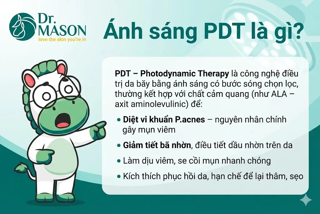 PDT – Photodynamic Therapy là công nghệ điều trị da bằng ánh sáng có bước sóng chọn lọc, thường kết hợp với chất cảm quang (như ALA – axit aminolevulinic) để:
