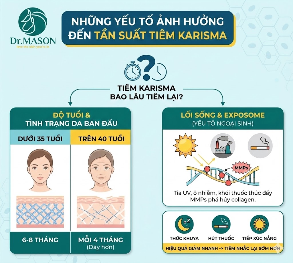 Mặc dù phác đồ chuẩn là 4-6 tháng tiêm nhắc lại, nhưng thực tế "tiêm Karisma bao lâu tiêm lại" còn phụ thuộc vào từng cá nhân. Dưới đây là các yếu tố chính:
