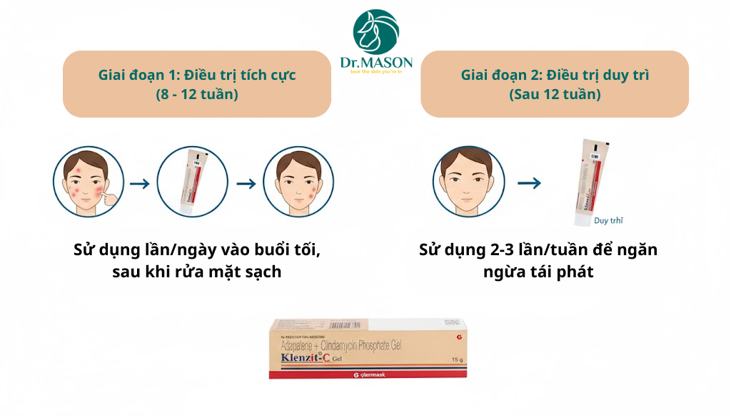 Sau khi hoàn thành tối đa 12 tuần điều trị bằng Klenzit C, bước tiếp theo là chuyển sang phác đồ duy trì. Mục đích của giai đoạn này là ngăn ngừa mụn tái phát và giữ cho làn da luôn sạch mụn. Bác sĩ sẽ chỉ định một sản phẩm không chứa kháng sinh Clindamycin. Thông thường, đó sẽ là sản phẩm chỉ chứa Adapalene đơn thuần (Retinoid duy trì) hoặc kết hợp với Benzoyl Peroxide. Adapalene rất quan trọng trong việc điều hòa sừng hóa, có thể được sử dụng lâu dài (vài tháng đến nhiều năm) như một biện pháp duy trì an toàn và hiệu quả, miễn là da dung nạp tốt [Mayo Clinic, 2025].