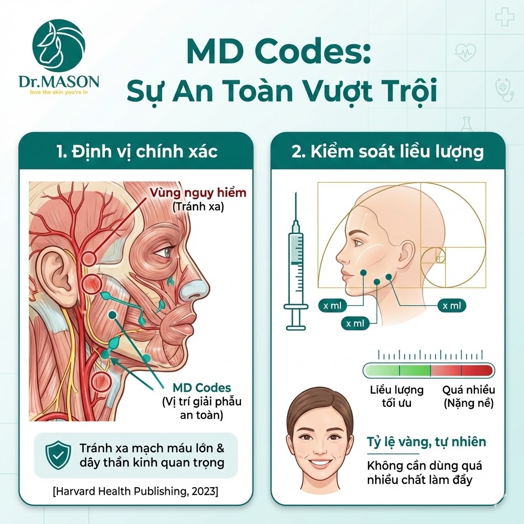 - MD Codes (Medical Distinction Codes): Đóng vai trò là "bản thiết kế kỹ thuật". Đây không phải là một loại thuốc, mà là một hệ thống các điểm tiêm được xác định chính xác trên khuôn mặt (gồm 75 điểm) do TS. BS Mauricio de Maio phát triển [Allergan Aesthetics, 2020].